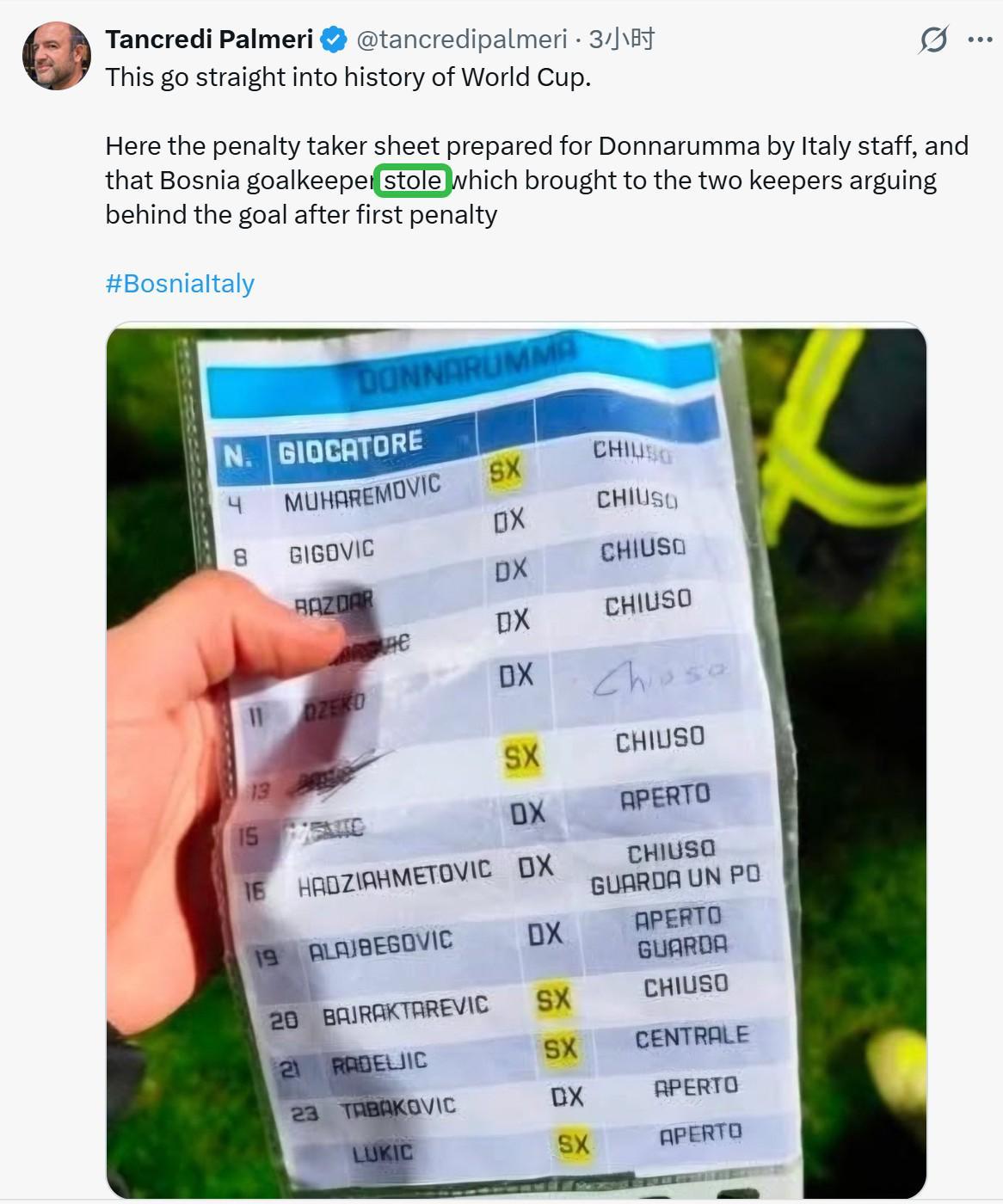 从比赛中的一段画面来看,我们只能看到波黑门将瓦西里手里拿着几张白色纸条,但由于清晰度原因,我们无法辨别他究竟是在保护自己的“点球秘籍小纸条”还是连同多纳鲁马的小纸条也一并拿走了。瓦西里拿着这几张纸条最终走到了一旁,而情绪激动的多纳鲁马也并未跟随。目前来看,意大利媒体以及波黑媒体各执一词。但最终在点球大战中,波黑队笑到了最后。